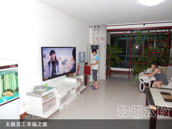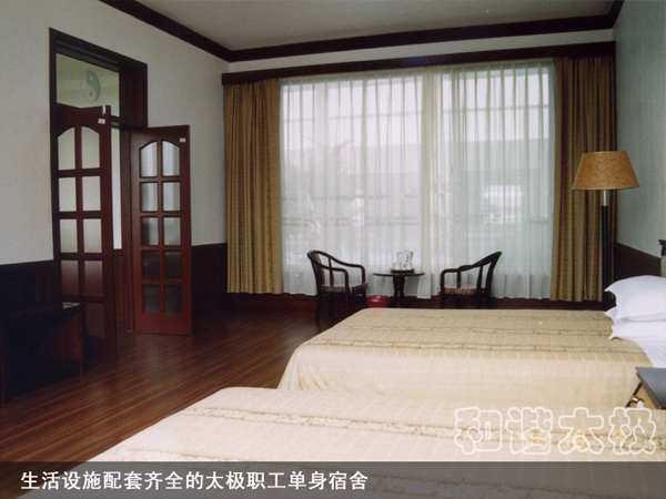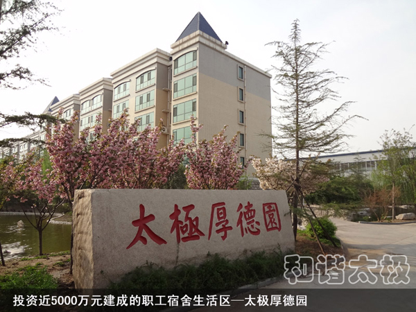 2008年,太極公司投資近8000萬元建成了職工公寓樓3座,戶外綠樹溪湖環繞,每戶面積170平米,統一配置60寸夏普電視等。所建成的職工單身公寓樓采用四星級標準,共176間房,人均戶面積50平米,統一配置電視、網絡、洗浴間、床柜、空調、暖氣、桌椅等。而且單身公寓內設有3000余平方米的生態園林和高檔游泳池,一年四季綠樹茂盛常春。